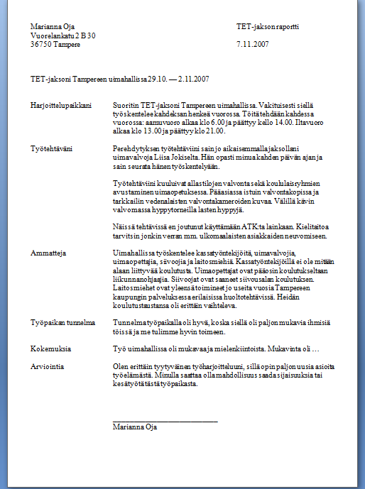 Kevätlukukauden aluksi oppilaat saavat kirjoittaa työharjoittelustaan TET-raportin. Sen lisäksi he kirjoittavat työhakemuksen ja ansioluettelon. Tähän menee kahden viikon oppitunnit.
