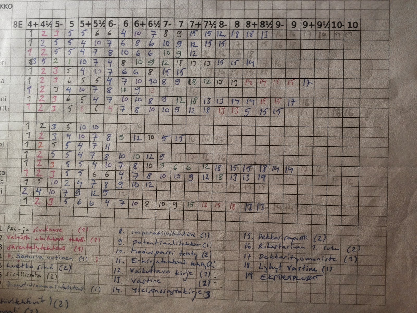 Kuvassa on toisen kasiluokkani plussataulukko. Plussataulukon lisäksi otan arvioinnissa huomioon koearvosanan ja muutaman kirjallisen työn, josta oppilaat ovat saaneet numeroarvosanan. Kahdeksasluokkalaisille olen antanut tänä syksynä numeroarvioinnin yleisönosastokirjoituksesta sekä dekkariraportista.