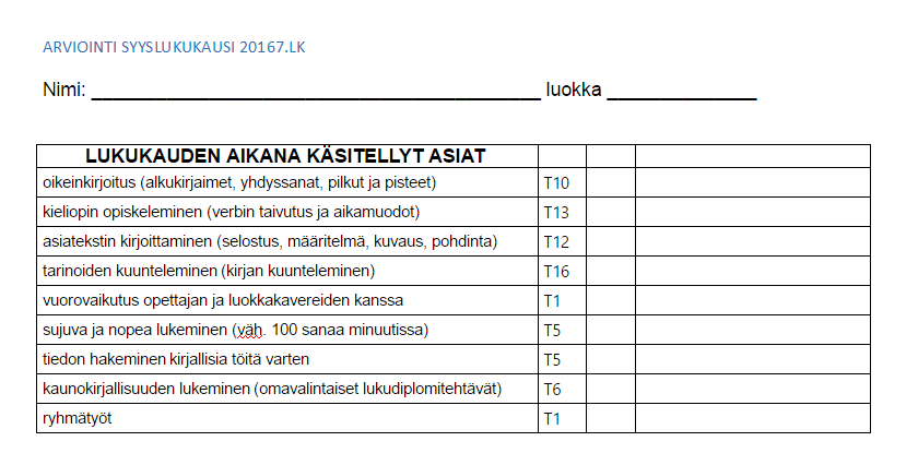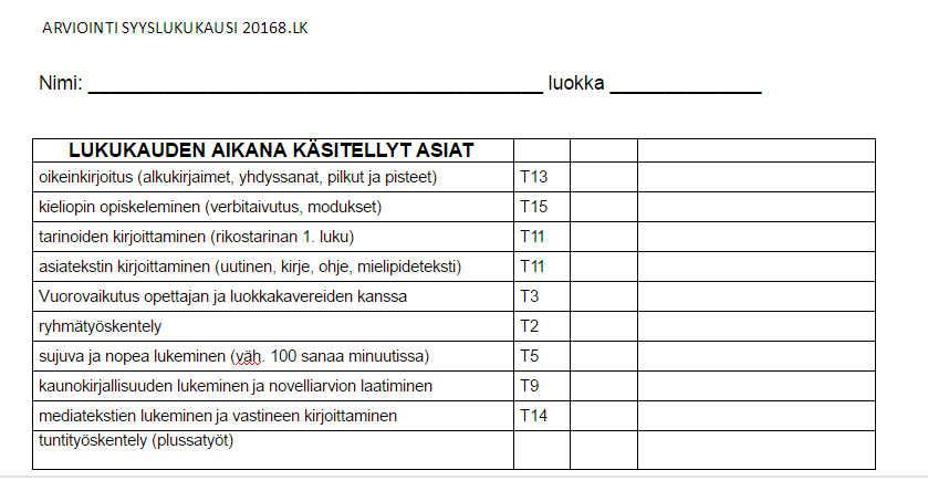 Merkitsin kaavakkeeseen lukukauden aikana käsitellyt asiat, viereen laitoin koodin, mihin OPS:n tavoitteeseen se liittyy ja sen viereen tyhjät tilat arvosanalle ja sanallisille kommenteille.