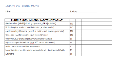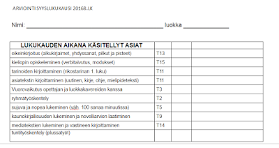 Aikaahan tällaiseen taas saa oikein mukavasti kulumaan, mutta minulle tulee hieman varmempi olo siitä, että olen arvioinut jokaisen oppilaan sanojen kriteerien ja tavoitteiden mukaan.