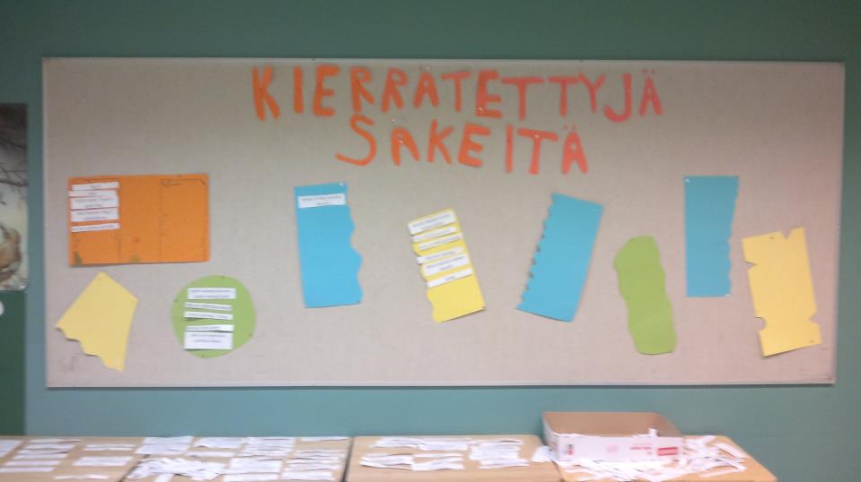 Luokan seinällä oli myös pieniä tauluja, joihin sai käydä kirjoittamassa runoja. Olimme seiskojeni kanssa tehneet runoharjoituksen, jonka ansiosta meillä oli 240 heidän kirjoittamaansa runosäettä tulostettuna paperiliuskoille, jotka sitten kiinnitettiin tauluun sinitarralla. Varsinkin pojat tykkäsivät kirjoitella niistä absurdeja runoja.
